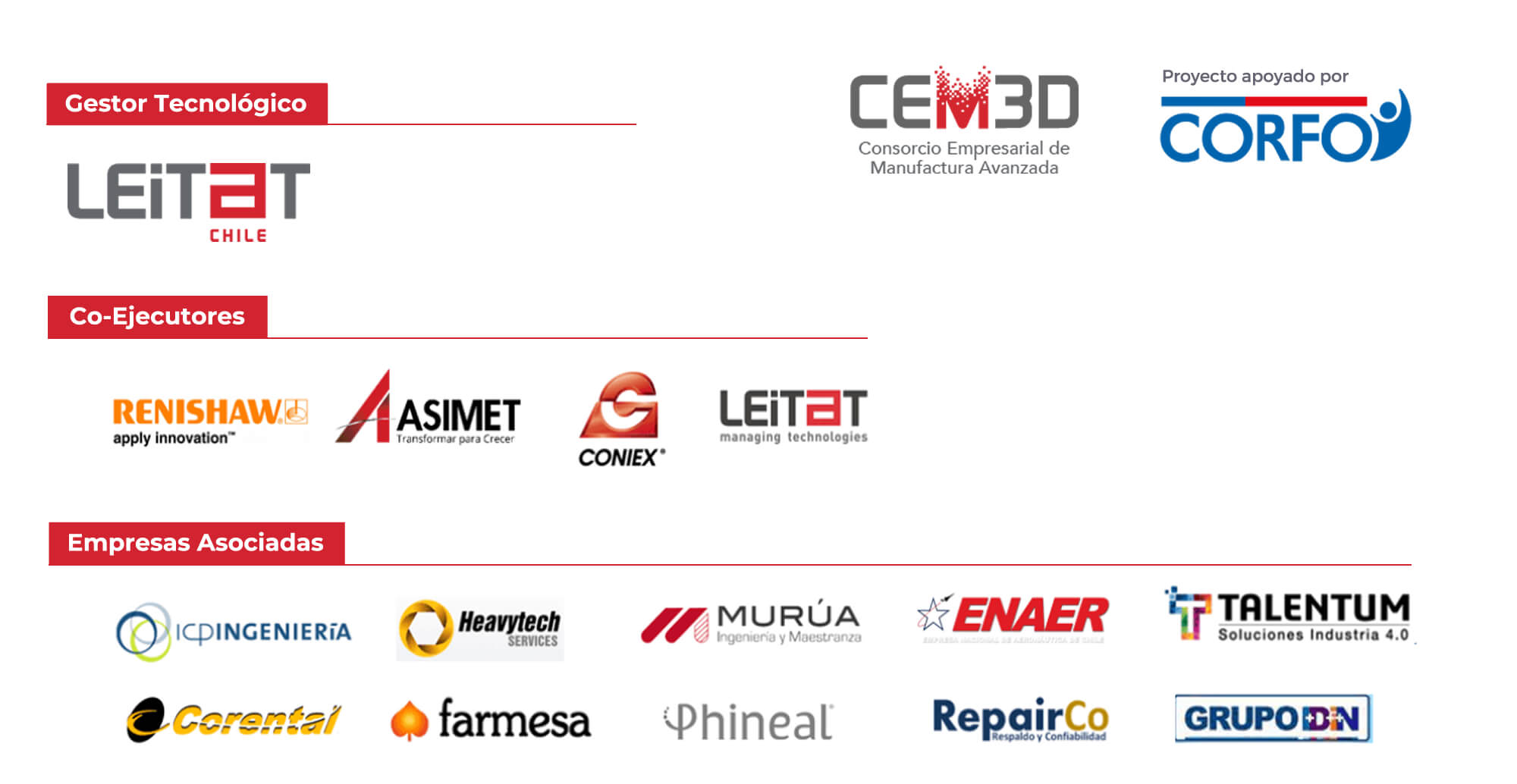Las empresas chilenas que han sido pioneras en la adopción de manufactura aditiva, asociadas a este programa, son: Talentum, ICP Ingeniería, REPAIRCO, Talleres Murúa, Heavytech, Phineal. Cada una de estas empresas ha integrado la manufactura aditiva de diferente manera. En algunos casos convirtiéndola en la base de su negocio, como proveedor de servicios o como proveedores de tecnología. En otros casos, ha servido para optimizar su cadena productiva minimizando la dependencia de proveedores internacionales mediante la impresión directa de, por ejemplo, moldes de arena para colada de fundición o imprimiendo directamente componentes metálicos.